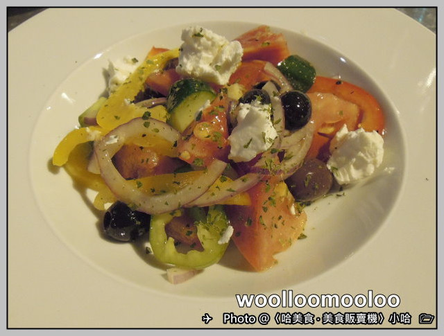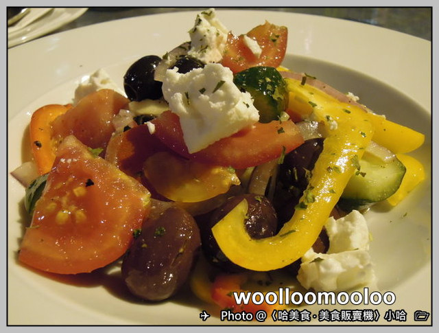 希臘沙拉上面佐的新鮮希臘羊乳酪,佐著拌上蕃茄與甜椒絲、生菜、橄欖,
