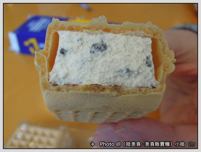 一口咬下香草冰淇淋脆餅,可以咬到巧克力豆包覆在冰品中..