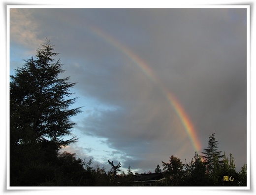 昨日的淒風苦雨依然把今晨的天空塗著陰濃的灰然而 當陽光乍現時 一道亮麗的彩虹 瞬間畫過天際把原有的黯淡 轉換成美麗的希望隨之起舞的心 已開始期待即將來臨的藍天