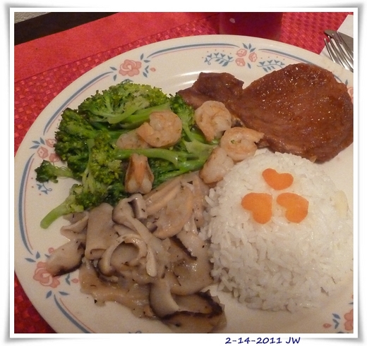 6:05 小女兒來電要我去接她回家, 趕緊關上爐火,抱起Romeo上車, 去接小女兒. 6:20 和小女兒前腳才入家門, 老公和大女兒後腳就到, 還好烤豬排和芥蘭蝦已在烤箱內保溫中, 白飯也好了, 只差一道炒磨菇. 老公一進門就喊餓, 趕緊快手快腳端出我的愛心套餐. 老公和女兒們眼睛為之一亮, 驚喜寫在臉上. 十分鐘後盤盤精光, 滿足感洋溢在每一個人的臉上, 這就是我的2011情人節晚餐.