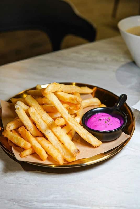 除了肋排,我們還點了炸魚薯條。金黃酥脆的外皮下,包裹著鮮嫩多汁的魚肉,搭配自製的蜂蜜芥末醬,酸酸甜甜又帶點微辣,口感層次豐富,令人回味無窮。而餐廳的招牌現打果汁,選用當季新鮮水果製作,口感清新,完美中和了烤肉的油脂感,讓整餐更加提味。