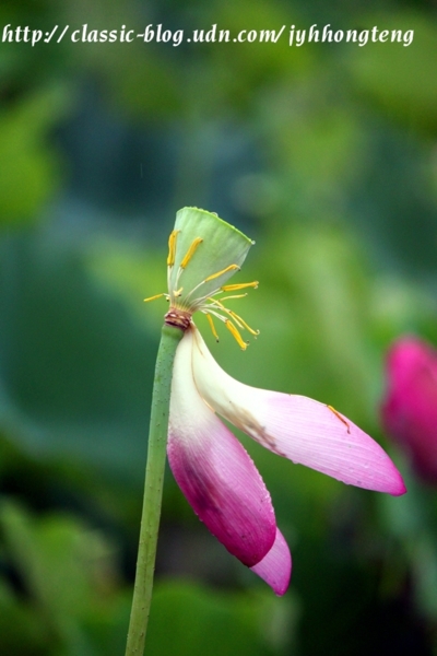 不敵幾番風雨,荷花難掩零落。但那鑲嵌著晶瑩水珠的粉紅花瓣,更見清麗脫俗,楚楚動人的丰姿真是我見猶憐啊!