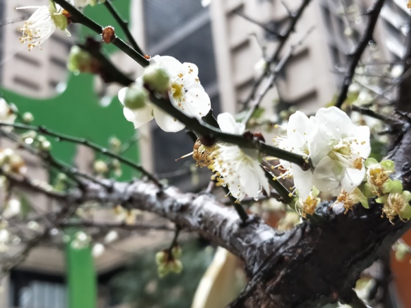 社區內幾株梅花枝形優美、有點枯老,梅開時節,朵朵梅花點綴在社區內。