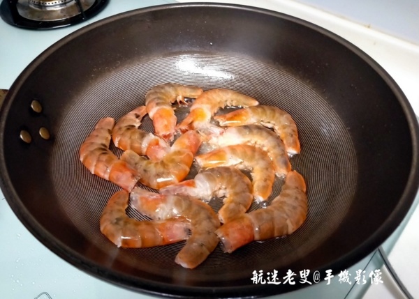 四、 下蝦用小火煸至蝦雙面熟透後翻面續煸。