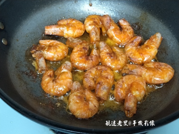 食材:大蝦、蒜、薑、葱、 醬油、糖、橄欖油