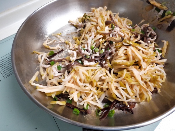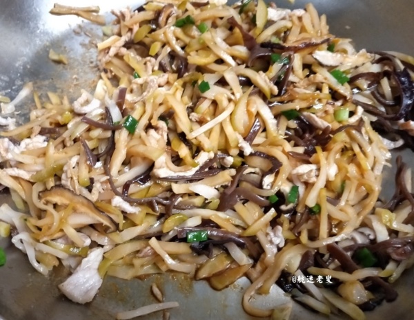 五、 翻炒至肉絲表面微微變色,後加入榨菜絲、黑木耳一起翻炒。