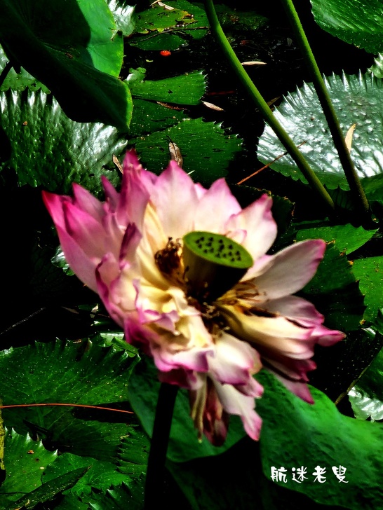 那並非尋常的殘荷,比較少見的牡丹荷,想必盛時曾有過牡丹般的雍容華貴,層疊花瓣,富麗堂皇,然而此刻,繁華散盡,只餘下觸目驚心的殘荷。