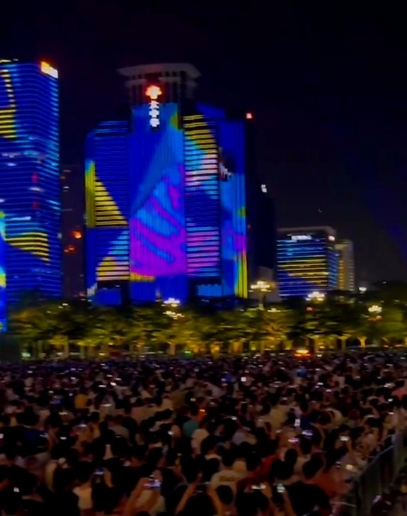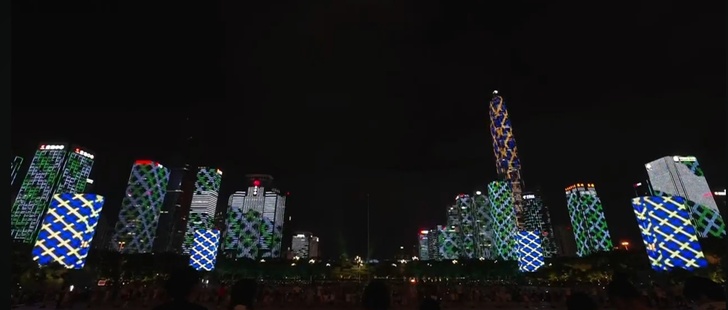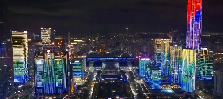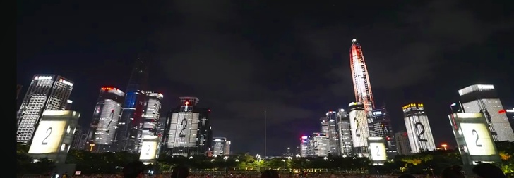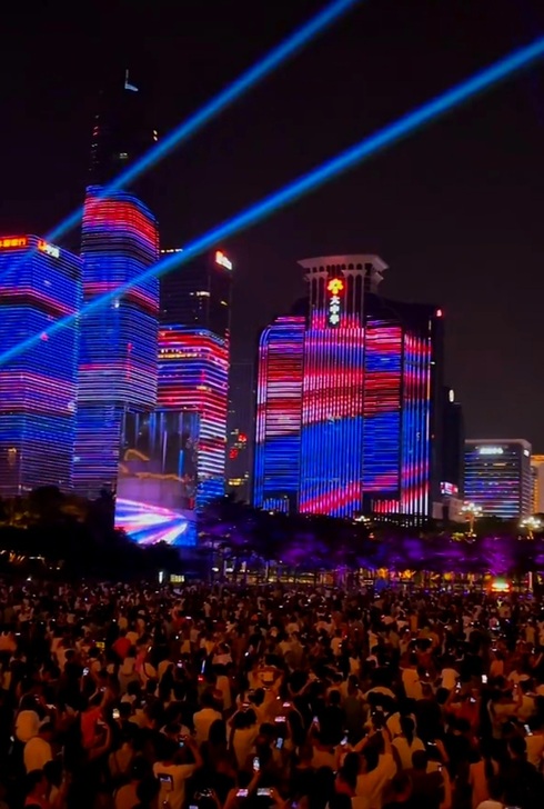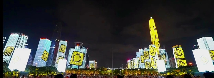 當燈光秀進入高潮,一幅幅流動的畫面出現在建築幕牆上,象徵著深圳作為國際貿易樞紐的地位。