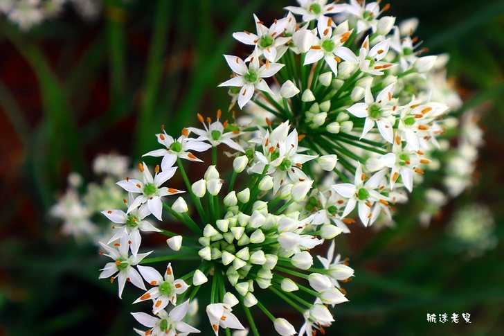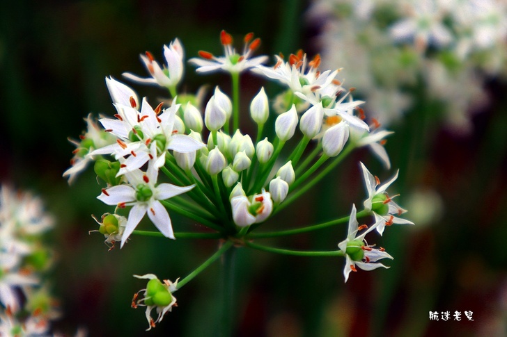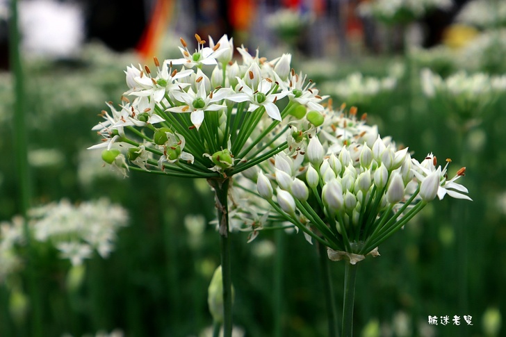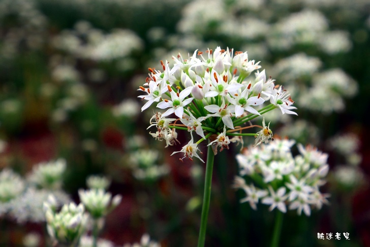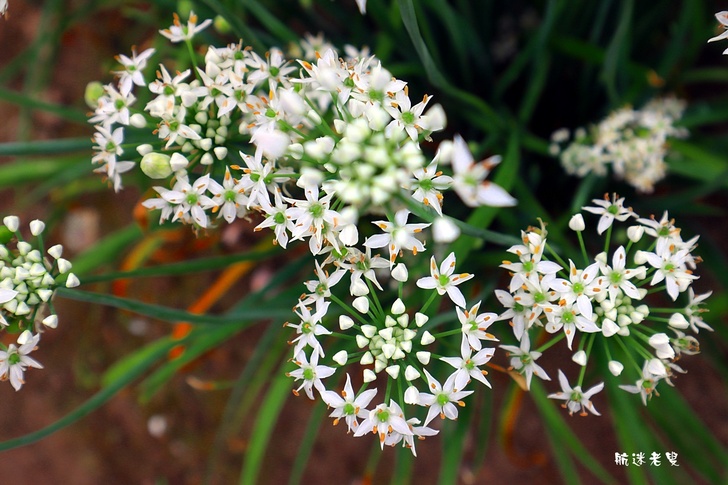 韭菜花海的特色,花瓣細小純白,組成圓球狀花序,看似雪白小煙火。