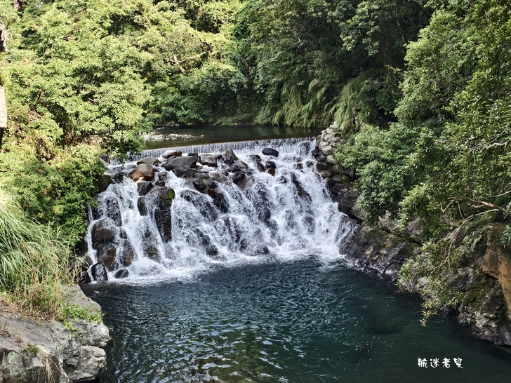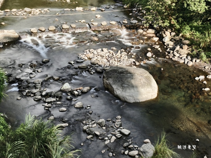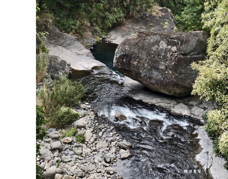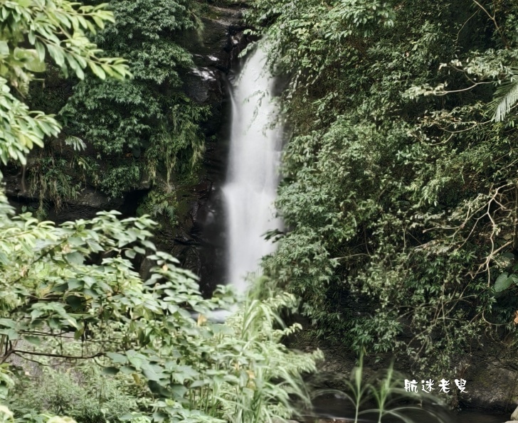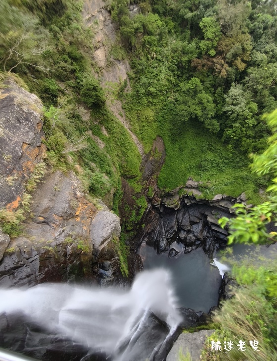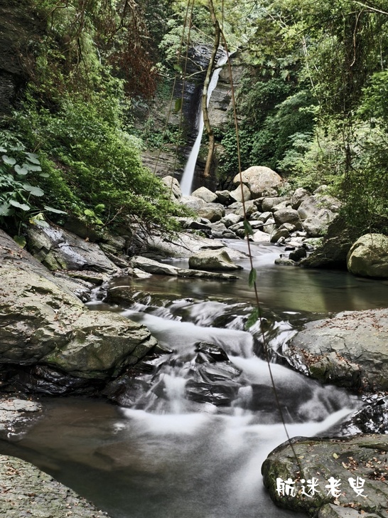 透過手機長焦鏡頭俯拍,畫面層次更分明,前景的溪水、近處的瀑布與山巒構成天然的構圖,怎麼拍都像風景明信片。