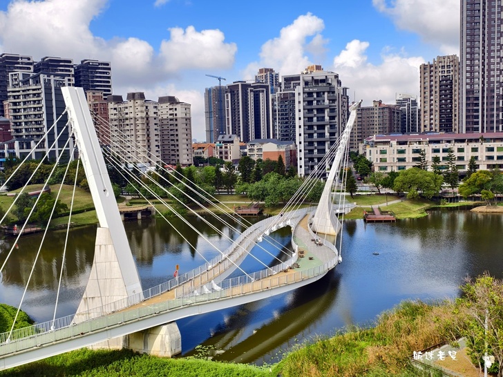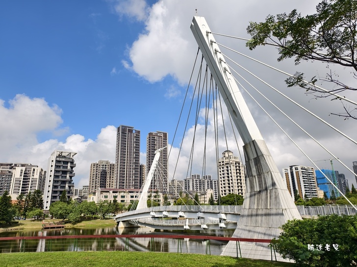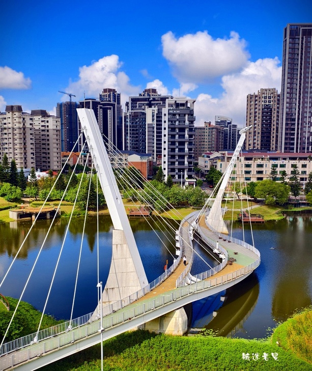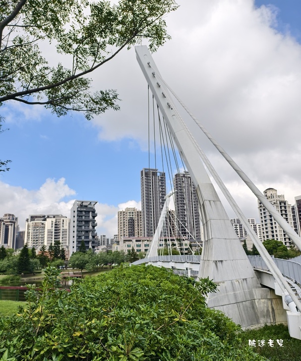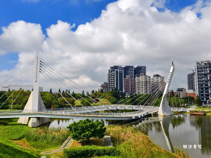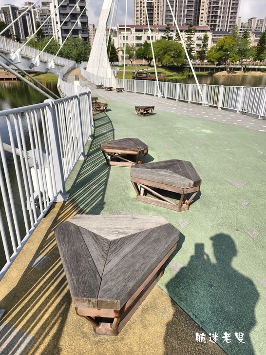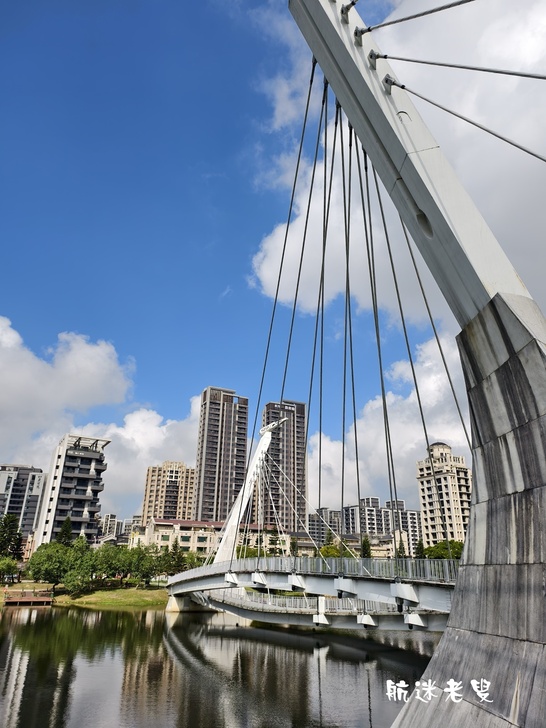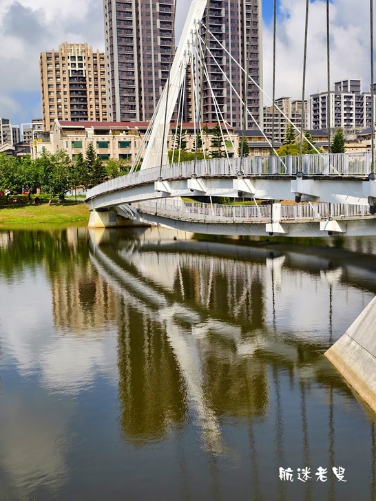 站在橋上往兩側看,一邊是水面與建築的倒影,一邊是園區開闊的空間感,不論是單純散步,還是拍照取景,這座吊橋都很適合當停一下的理由。