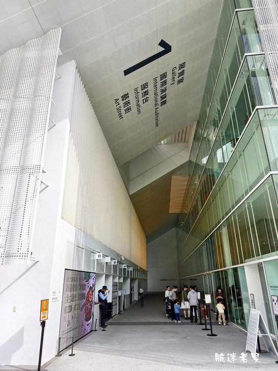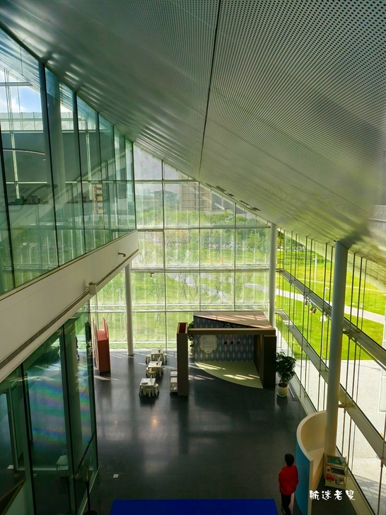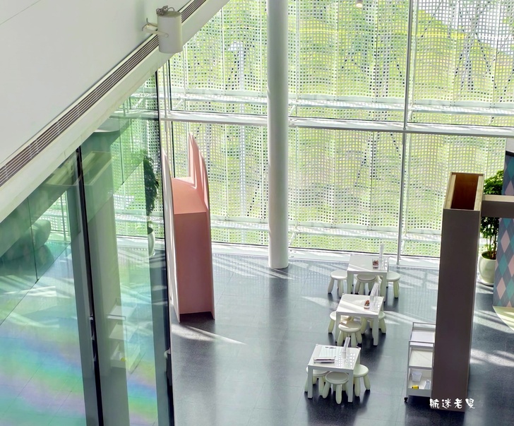 桃園市兒童美術館通透的玻璃結構引人抬頭仰望,可見的天花指標也獨具巧思,讓人一眼明白各層樓有哪些空間與服務。