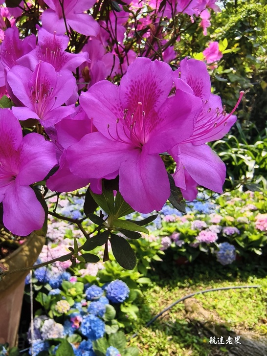 杜鵑花的風頭全被雨聲片彩色花海搶光,藍紫粉白漸層交錯,繡球花球大,要蹲下抓拍盛開杜鵑驚豔到,兩種花同框競豔,這波春天福利給滿分!