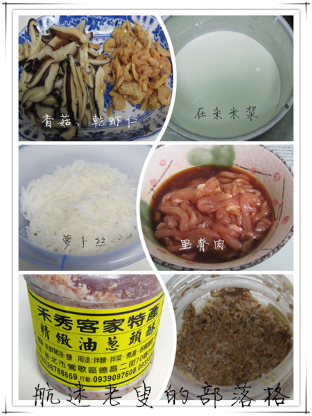 在來米粉電鍋量杯五杯(坊間有售小包裝的米粉)、白蘿蔔一條、香菇數朵、乾蝦仁、里脊肉隨意,調味料:白胡椒粉、醬油、米酒少許。
