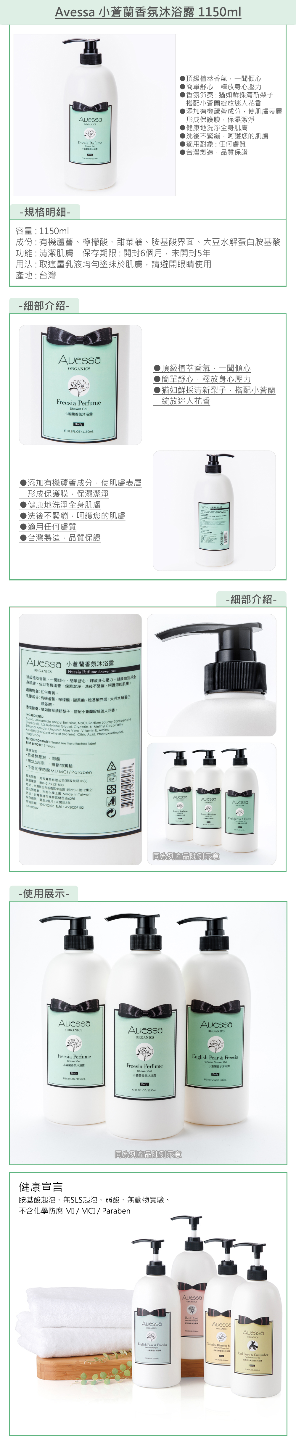 此款【Avessa 小蒼蘭香氛沐浴露 1150ml ORGANICS】採頂級植萃香氣,讓人一聞傾心。添加有機蘆薈成分,使肌膚表層形成保護膜,保濕潔淨。