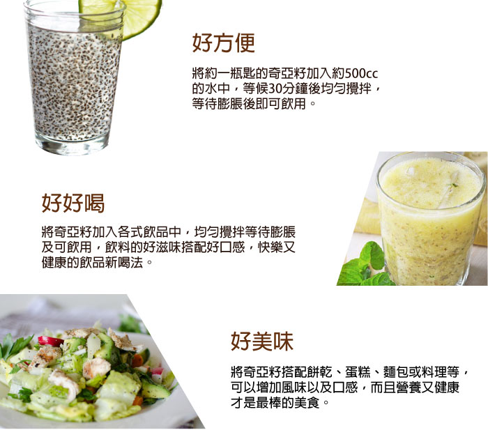 - 可加入開水、果汁、牛奶等飲品或灑在米飯、沙拉等各式料理食用