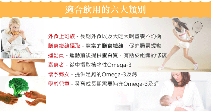 - 含人體必需脂肪酸Omega-3、蛋白質、鈣、鐵等多種人體所需營養素