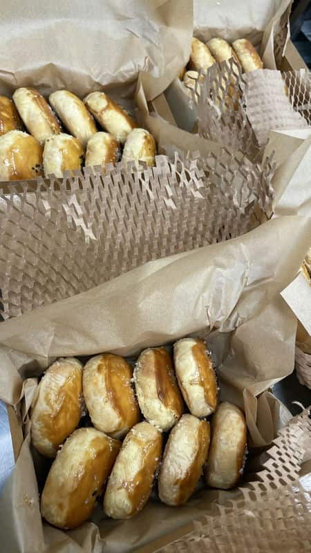 第一個理由,當然是它的食材講究。晴天菓子的甜燒餅選用了頂級的日本面粉,讓整個餅皮細緻而有韌性。再搭配紐西蘭無水奶油和法國AOP發酵奶油,這種濃郁的奶香讓人一吃就停不下來。最後,再撒上一點法國鹽之花,這樣的鹹甜滋味,真的是一絕。