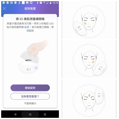 首先先將藍牙連線,打開美肌測量儀,等待3秒確認LED指示燈持續閃爍藍燈,按開始配對,完成後會顯示完成,檢測前要先把臉清洗乾淨