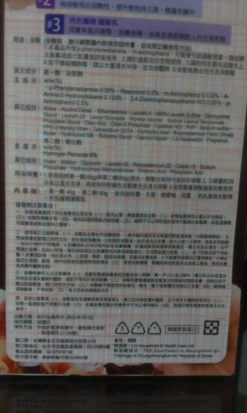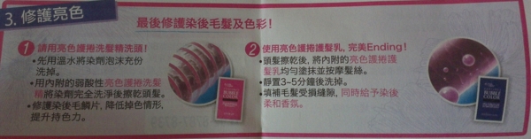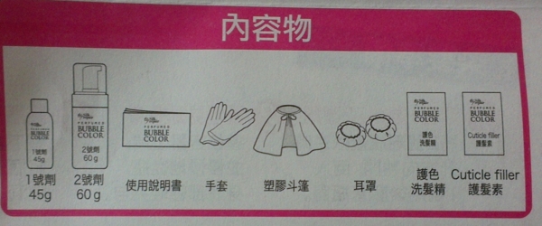 一般市面上,就我使用的他牌的經驗中,頂多有1。2號劑,說明書,手套,護色洗髮精,護髮素