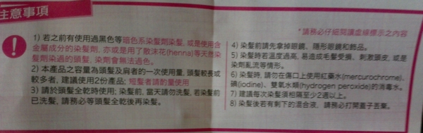 >染髮偶爾會發生嚴重過敏反應,以前曾因染髮劑(不限本產品)過敏者或產生不適應者,請勿使用。