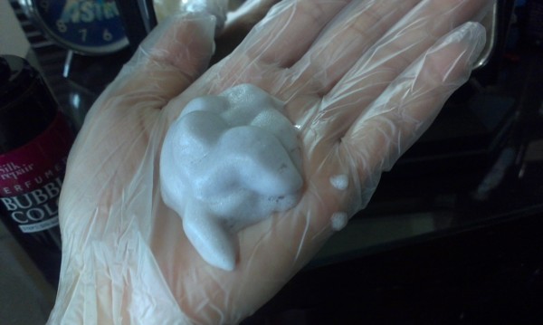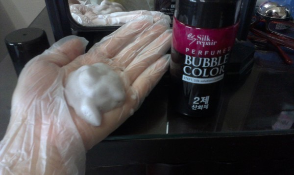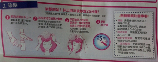 將泡沬均勻塗抺於髮絲,在塗抺時,並沒有聞到刺鼻染劑異味!