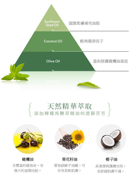 ◎ 檸檬馬鞭草橄欖沐浴膠-檸檬馬鞭草精油的澄靜芬芳,沐浴後讓身心能更舒緩放鬆,肌膚更自在的呼吸。