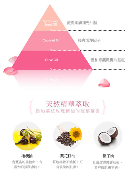 ◎ 荔枝玫瑰橄欖沐浴膠-荔枝玫瑰精油的馥郁馨香,沐浴後隨著香甜的氣息,能消除身心的疲憊,給肌膚更溫柔呵護。