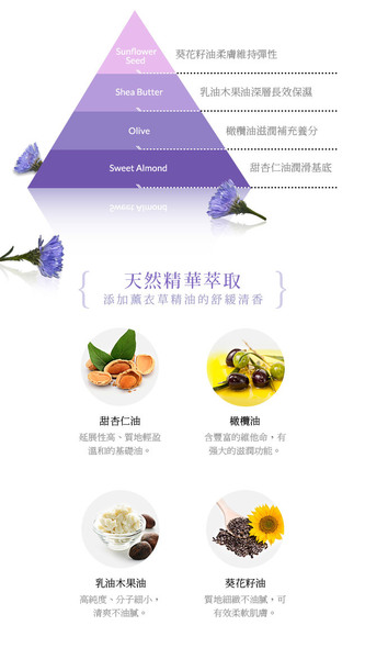 ◎ 薰衣草乳油木果身體乳-薰衣草精油的舒緩清香,可安撫情緒和緩解壓力,不止肌膚更光滑柔細,連身心也得到解放。