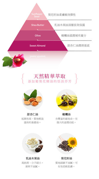 ◎ 蜀葵花乳油木果身體乳-蜀葵花精油的恬淡芬芳,調理肌膚紋理,提振活力,不止肌膚光滑柔細,連心情也清新舒暢。
