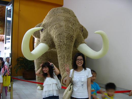 在排隊的入口附近放了一隻很大隻的Q版長毛象大公仔,很多人都在那裡跟長毛象拍拍,我旁邊有一位不認識的少女不小心跟我一起入鏡,但是你在模仿的是牛還是長毛象?長毛象的象牙不是長在頭頂上的!