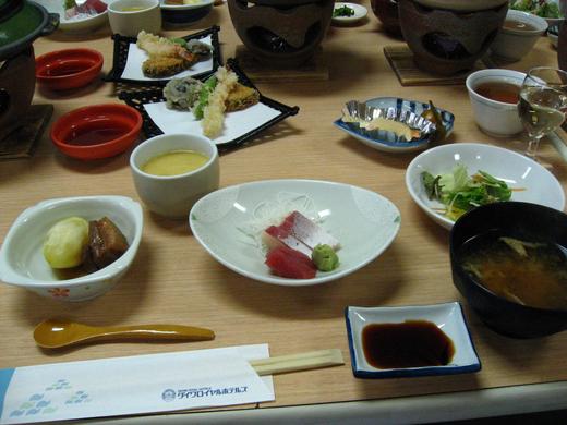 第一天的晚上我們住宿在紀州南部ROYAL HOTEL,晚餐就吃飯店準備的和式迎賓御膳宴席料理,較正式一點的手續是先回房間洗澡洗好之後換上浴衣,到用餐的餐廳去用餐。但是因為我們是外國人所以就可以隨興一點,同團中有人沒有換上浴衣,我們一家人因為在是太興奮太好奇了除了穿單薄的浴衣之外連同冬天才需要穿的外罩都給穿上了,超有日本fu的~~~好興奮好開心~~~