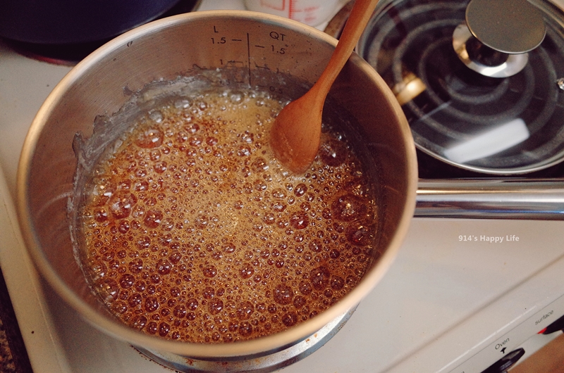 這次自己第一次煮焦糖,一開始白泡泡的煮沸後,一直在懷疑真的會像書上和網路上寫得那樣,白砂糖可以煮成焦糖色嗎?!用木湯匙攪拌攪拌著,耶~~~ 終於在10分多鐘後好像有點開始變色