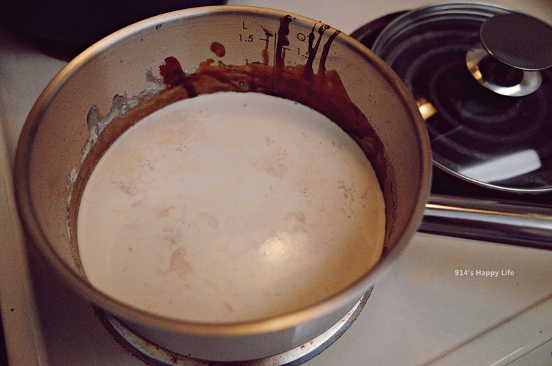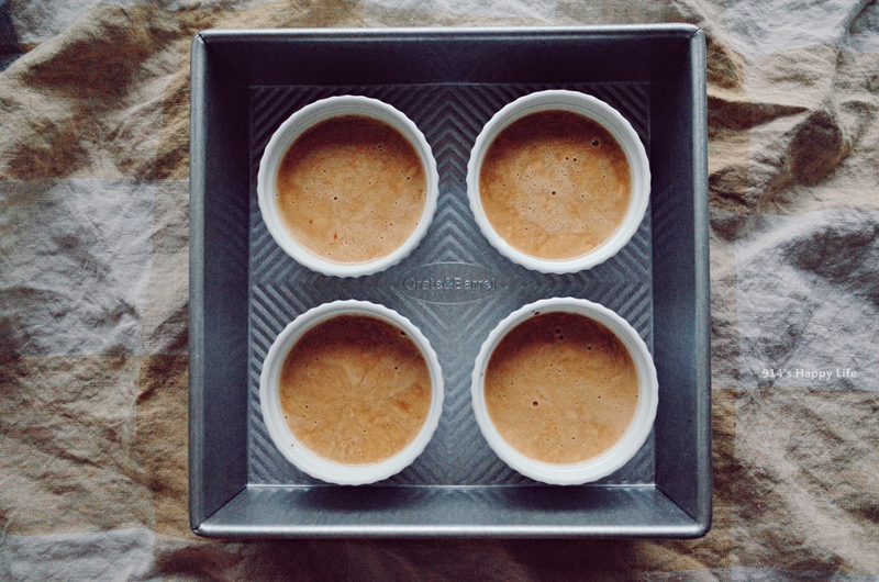 我就是在這個步驟時,自己加了一小匙的香草精和兩大匙的咖啡酒,和其他的材料一起拌勻,備用。等焦糖倒入烤皿後,用原鍋去煮布丁液體的部分,也就無不會浪費才還在鍋中的焦糖囉!