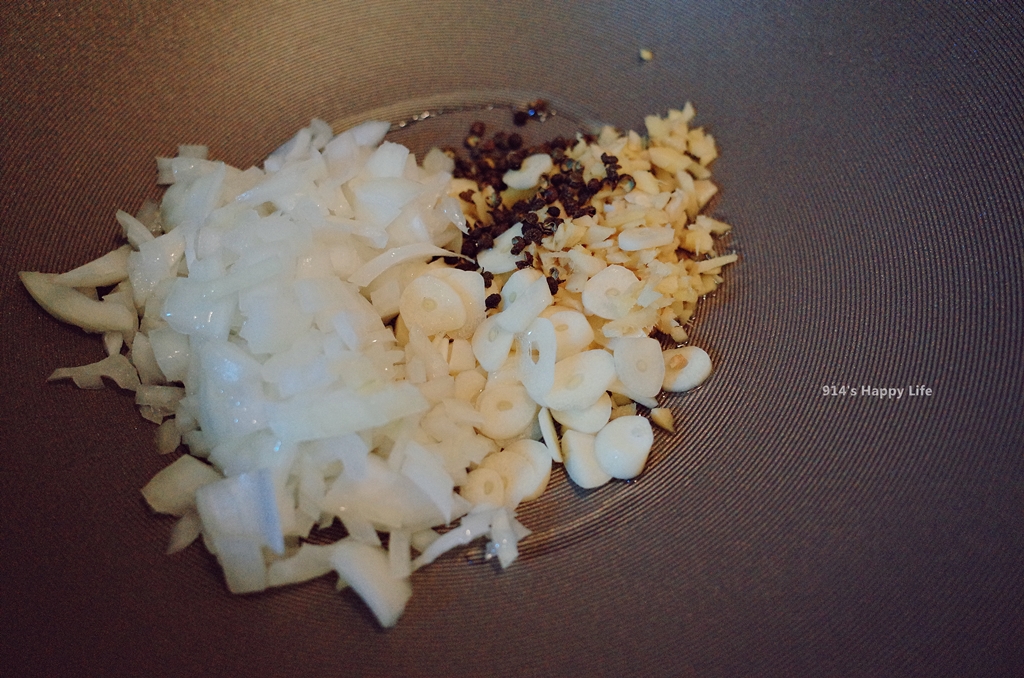 1. 將蒜切片、洋蔥切丁、老薑切末,放入炒鍋中和花椒粒一起爆香至洋蔥變透明。(此刻應該炒至有花椒香)