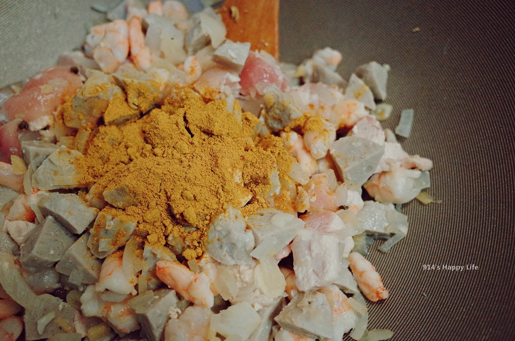 3. 放入咖哩粉炒香至盡量讓咖哩粉分布均勻。
