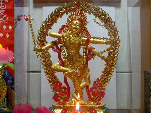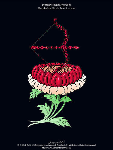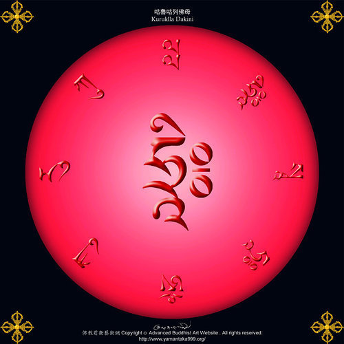 咕如咕咧佛母之一面表法性一味;三目表通達三世。四臂表四種事業成就,或四無量心,慈悲喜捨具足。微怒表調伏四魔。足踏外道女魔之心,表壓治一切違緣障礙。身紅色表懷愛法,蓮華部屬性。