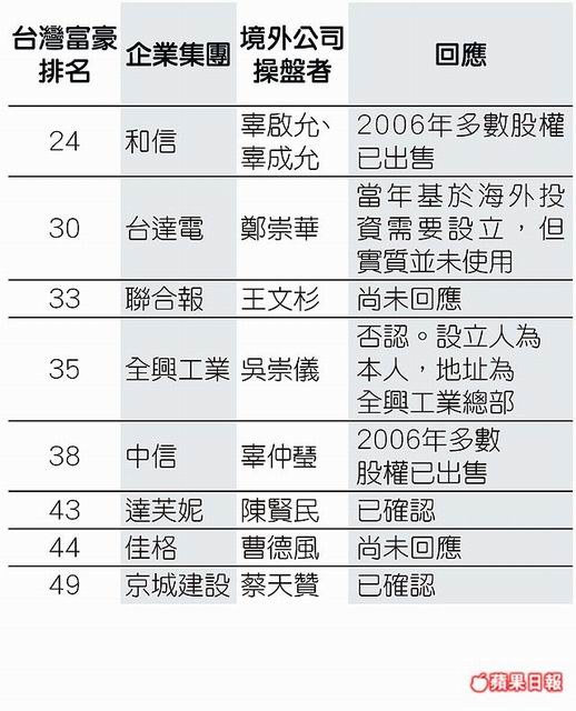 國際調查記者同盟(The International Consortium of Investigative Journalists,ICIJ)昨公佈所掌握的秘密文件顯示,中國多名權貴的家人在加勒比海的避稅天堂設有境外公司,而《天下》雜誌取得的資料庫內容亦顯示,台灣富豪有境外財產者,至少有:旺旺蔡家、富邦蔡家、頂新集團魏家、新光吳家、京城建設蔡家、台達電鄭家、佳格曹家、和信辜家、中信辜家、聯合報系王家、達芙妮陳家、全興精機吳家等12個家族。