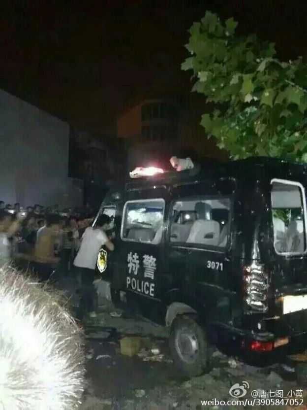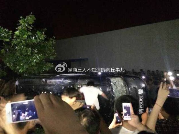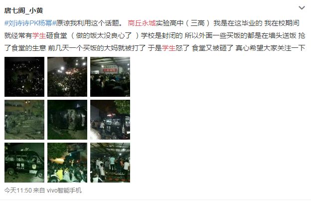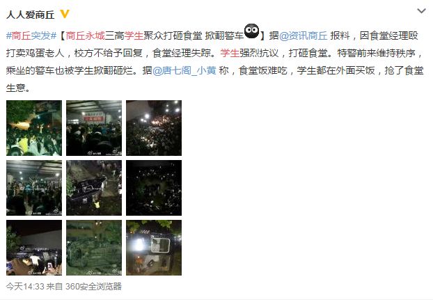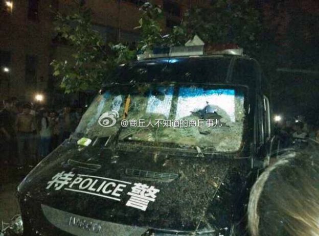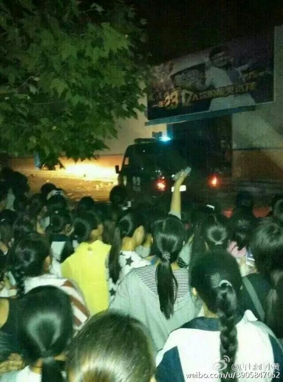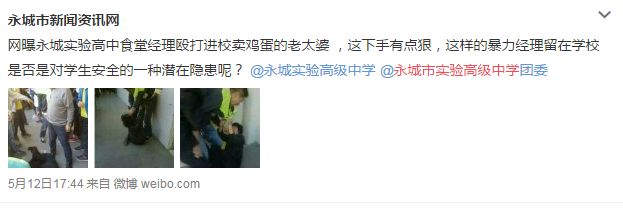 5月14日晚,河南省永城市實驗高級中學(原永城三高)上千學生示威,砸毀學校食堂、超市,抗議食堂經理毆打老人。大量特警到校抓捕學生時被圍,警車被砸毀掀翻。12日,學校食堂經理將一名賣茶葉蛋的老人打傷,事後,校方未對事件作出回應,引發學生不滿。