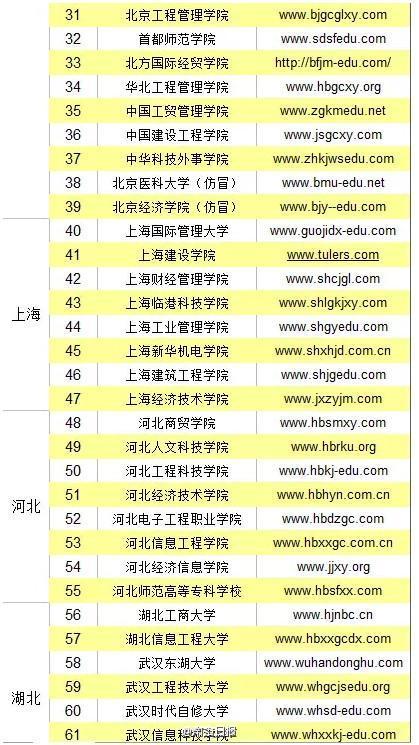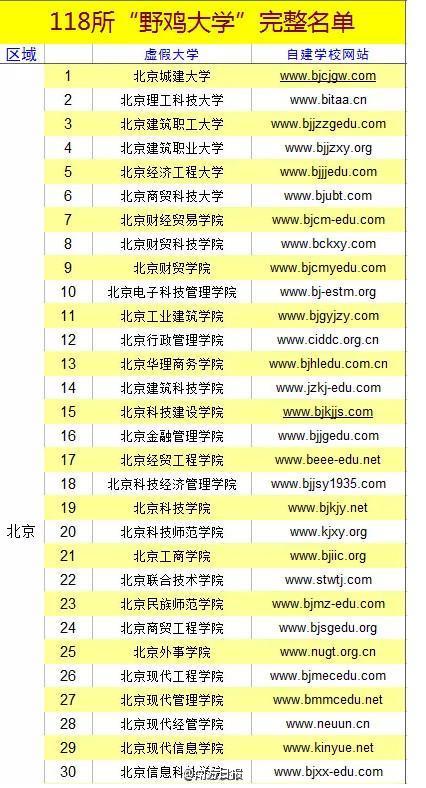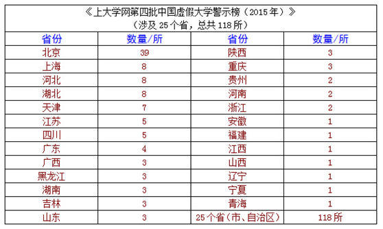 《第四批中國虛假大學警示榜》顯示,118所虛假大學涉及25個省市,其中北京市最多,有39所,上海、河北、湖北也各有8所。