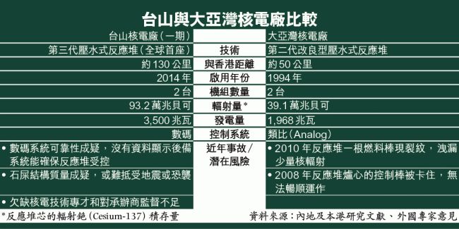事緣去年4月,法國核安全局通報,正在法國興建、與台山同樣採用EPR技術的弗拉芒維爾核反應堆的壓力容器頂蓋和底部的鋼材,由於碳元素含量過高,沖擊韌性遠低於安全標準。該壓力容器重達410噸,高12.7米,直徑5.7米,是用來承載核燃料的圓柱型鋼結構,需抵受極端溫度(攝氏351度)、壓力(175bar)和核輻射,是防止核燃料外洩的關鍵設備。由於EPR反應堆裝載的核燃料輻射量屬全球最高,例如台山廠每台內含幅射物質總量是福島第一號機組的三倍,所以一旦容器破裂,後果不堪設想。