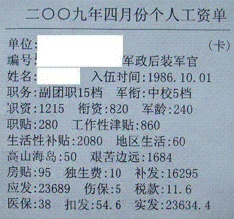 一個為國防事業堅守在一線的副團職指揮軍官,他遠離家鄉,有一個還在唸書的孩子,一個待業在家的妻子,每個月拿7400元,而06年07年到08年6月,他每個月的收入是5000以下,而在06年6月前他的工資每個月只有2300左右,還有一點,軍人沒有年底獎金分紅這一說。