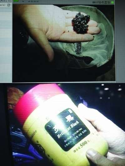 女攤主還現場演示染色的過程給記者看,她從「亮黑」的包裝桶裡挑出一點粉末,然後放在臉盆裡沖出一盆「墨汁」,抓來一把米浸泡其中,僅僅5分鐘後,米粒就染上了淡淡的黑色。