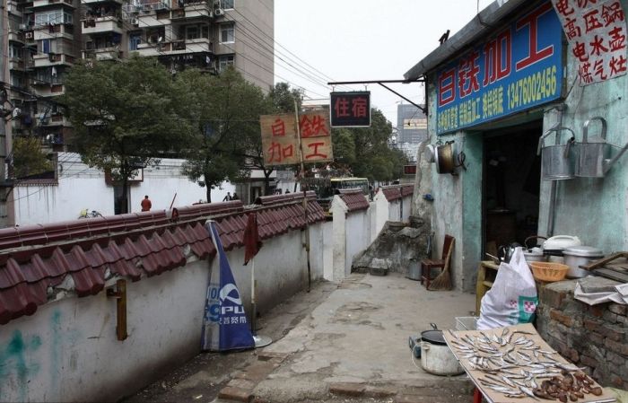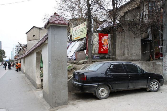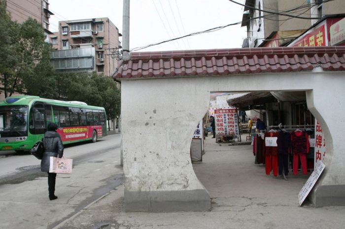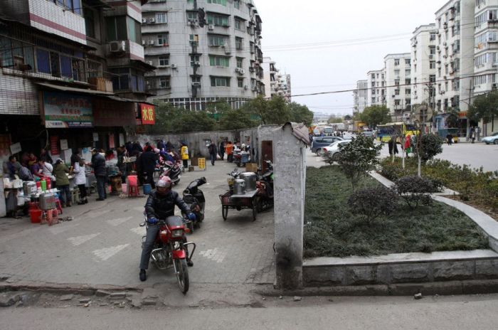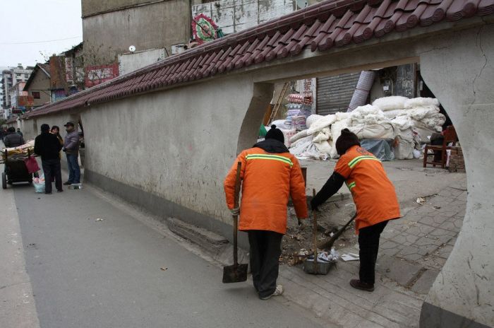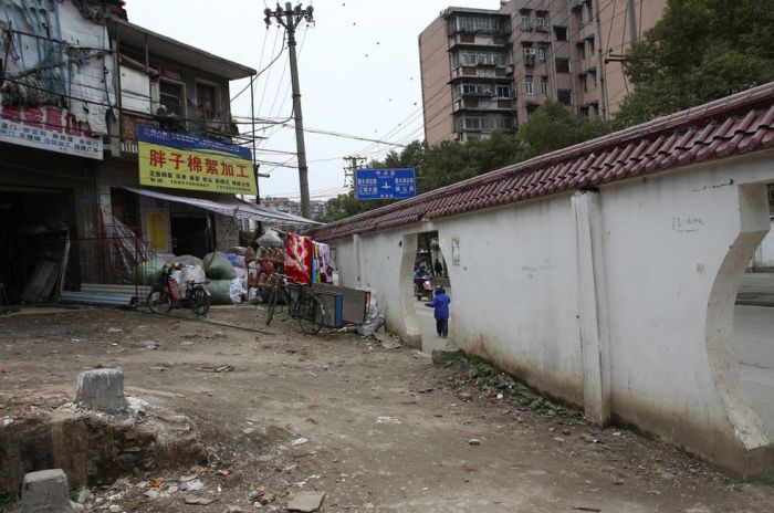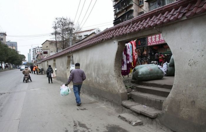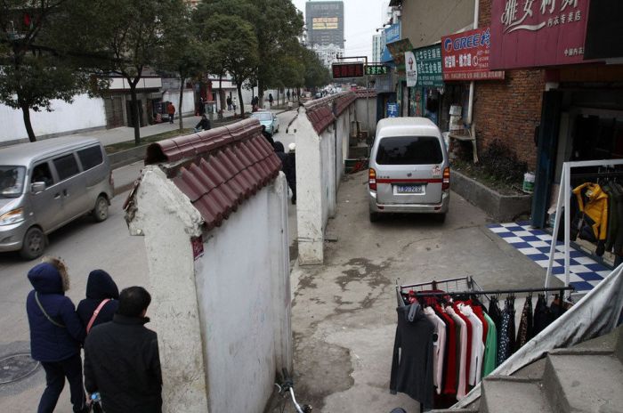 2013年1月3日,武漢麒麟路,在人行道砌的被人戲稱為「遮羞牆」的圍牆。這樣的牆有四處,牆頂貼有琉璃瓦,從臨街門面到牆根大約有3米的距離,不少行人走在本來就不寬的機動車道上,經常導致堵車。