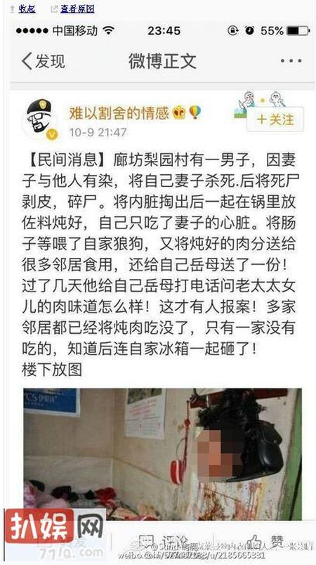 消息顯示,廊坊梨園村有一男子,因妻子與他人有染,將妻子殺害,並剝皮碎屍。