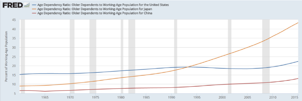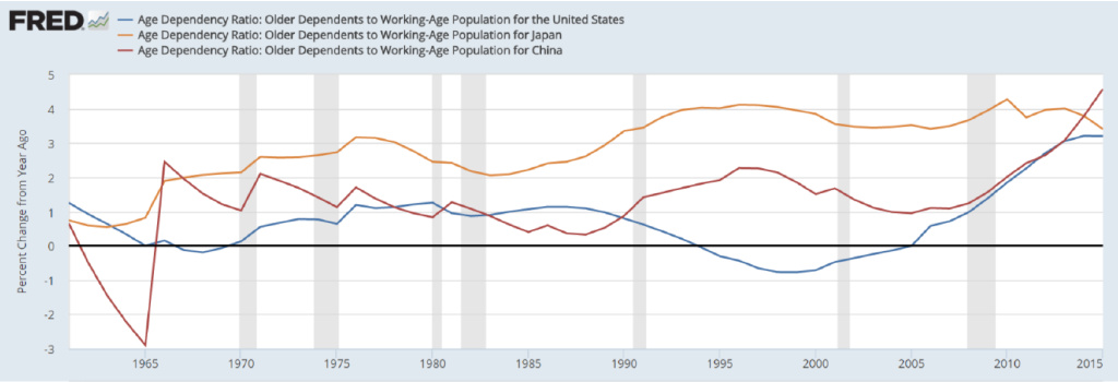 過去55年中,老年扶養比(65歲以上人口占15~64歲勞動年齡人口比例),美國從15.2%小幅升至22.3%,日本從8.9%大幅升至43.3%,中國從6.5%翻番至13%;更值得關注的是,由於你懂的原因,中國老年撫養比年增速已經在2014年超過日本…