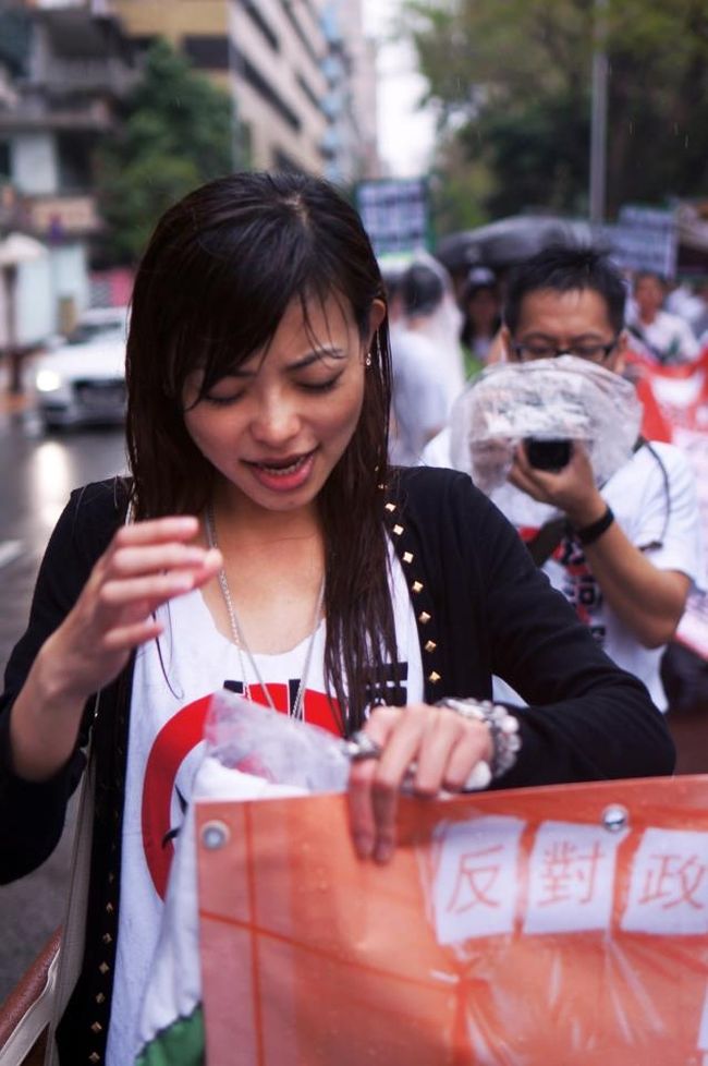 遊行中的旖施,全因有她。她叫甘雪玲,是一位教師,她在遊行後在Facebook留言說:「今天,我們踏出了成功的一步,很多青年朋友都主動參與遊行。因為,他們知道立法會在間選、委任議員的保駕護航下,全部有利市民的法案(工會法、家暴法、路環保護法案)全部被否決,23-28元最低工資更是令人髮指。澳門人開始意識到自身利益在不斷受到侵害,澳門人開始知道每年8,000元並不能解決長遠住屋問題。今天,有幸與各位,一齊踏出成功的一步!」
