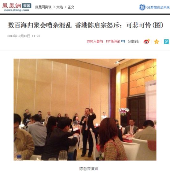 歐美同學會100週年論壇午餐會,香港恆隆集團主席陳啟宗登台演講,出人意料地怒斥宴會廳幾百名海歸,只顧各自交談,嘈雜混亂,對前面講演的汪潮湧、張磊,缺乏基本尊重,忘卻中華禮儀,為曾經“走出去”、“國際化”、“高素質”的海歸的現場表現,感到可悲、可憐,猶如當頭棒喝,贏得全場掌聲與感動!