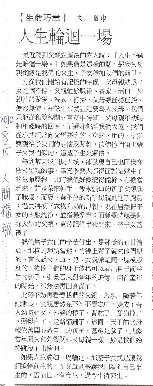 人生輪迴一場 2010.8.15 福報生命書寫【生命巧聿】專欄