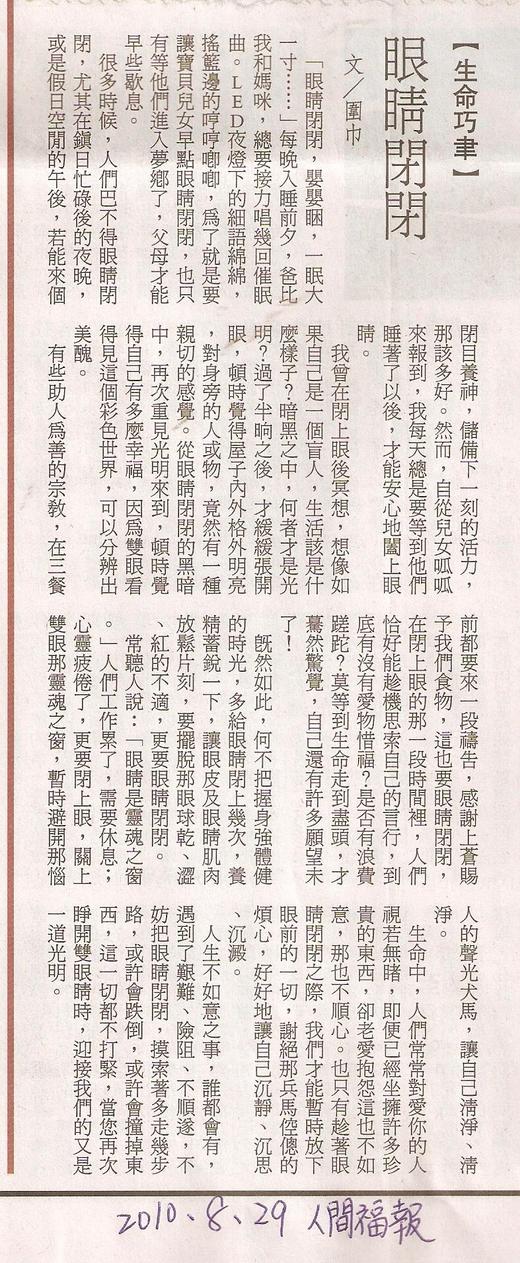 常聽人說:「眼睛是靈魂之窗。」人們工作累了,需要休息;心靈疲倦了,更要閉上眼,關上雙眼那靈魂之窗,暫時避開那惱人的聲光犬馬,讓自己清淨、清淨。